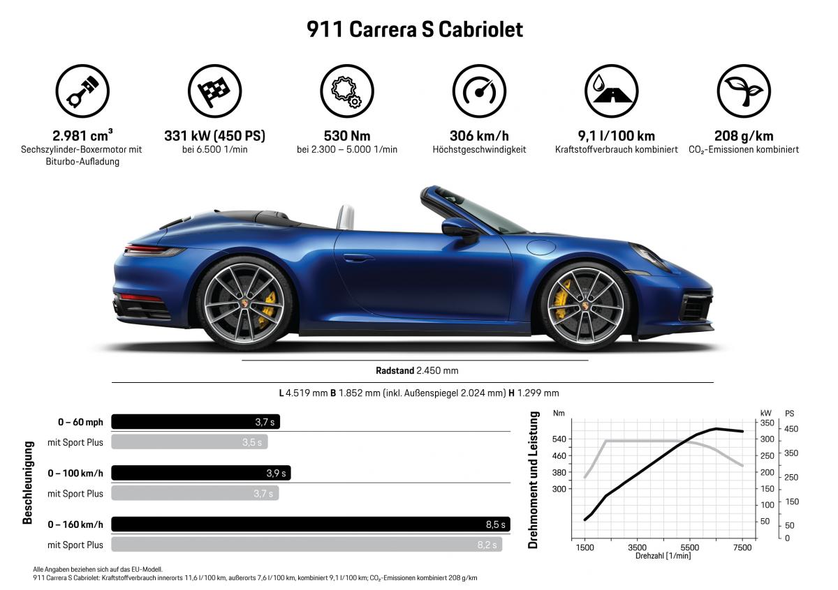На момент запуска 911 Cabriolet будет доступен в модификациях Carrera S* с задним приводом и Carrera 4S* с полным приводом. Обе модификации оснащаются 6-цилиндровым оппозитным турбированным двигателем с рабочим объемом 2981 см³. Его мощность составляет 331 кВт (450 л.с.) при 6500 об/мин, а крутящий момент – 530 Нм в диапазоне от 2300 до 5000 об/мин. Показатели экономичности и уровня вредных выбросов также были улучшены за счет доработанного процесса впрыска и ряда дополнительных усовершенствований, включающих в себя новую компоновку турбонагнетателей и системы охлаждения наддувочного воздуха. За передачу мощности отвечает новая 8-ступенчатая автоматическая коробка передач с двумя сцеплениями. Porsche 911 Carrera S ускоряется до 100 км/ч за 3,9 секунды (с опциональным пакетом Sport Chrono: 3,7 секунды), а максимальная скорость модели составляет 306 км/ч. 911 Carrera 4S способен разгоняться до 304 км/ч, а отметку 100 км/ч он преодолевает спустя 3,8 секунды (с опциональным пакетом Sport Chrono: 3,6 секунды).