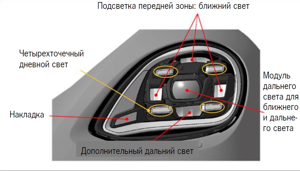Базовый вариант головной фары имеет расположенную по центру линзу, которая с помощью светодиодов производит ближний и дальний свет. Рядом сверху и сбоку расположена подсветка передней зоны, реализуемая при помощи небольших рефлекторов на основе светодиодной технологии. Подсветка передней зоны обеспечивает достаточную яркость в ближней зоне автомобиля, так как при использовании светодиодного освещения имеется резкая светотеневая граница.