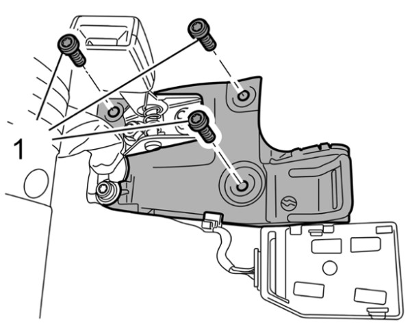 Выкрутить 3 крепежных винта -1- крепежного кронштейна замка ремня безопасности.
