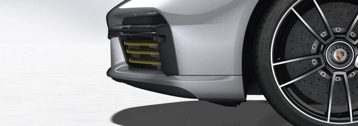 Активный передний спойлер 911 Turbo был значительно усовершенствован. По сравнению с предшественником его рабочая поверхность была увеличена. Процессом выдвижения и возврата в исходное положение можно управлять быстрее и при меньшем давлении. Исполнительные элементы позволяют по отдельности надувать три сегмента. Оба боковых исполнительных элемента всегда работают синхронно. Передний спойлер изготовлен из эластичного полимера (эластомер) и может скручиваться так, что средний сегмент при выдвинутых сегментах может оставаться в убранном положении или же тоже быть выдвинутым. Имеется несколько возможностей регулировки: