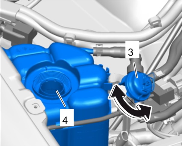 Привести сервисную скобу комбинированного клапана удаления воздуха -3-в сервисное положение при процедуре слива и залива ОЖ (включая прокачку). Комбинированный клапан удаления воздуха находится рядом с заливной горловиной расширительного бачка ОЖ -4-.