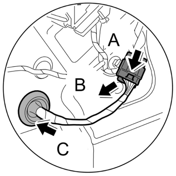 Выдавить резиновую втулку наружу -C- и извлечь кабель наружу через отверстие.