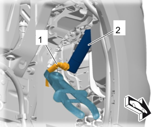 3 Разблокировать и отсоединить шланг -1- на форсунке омывателя фар -2-.