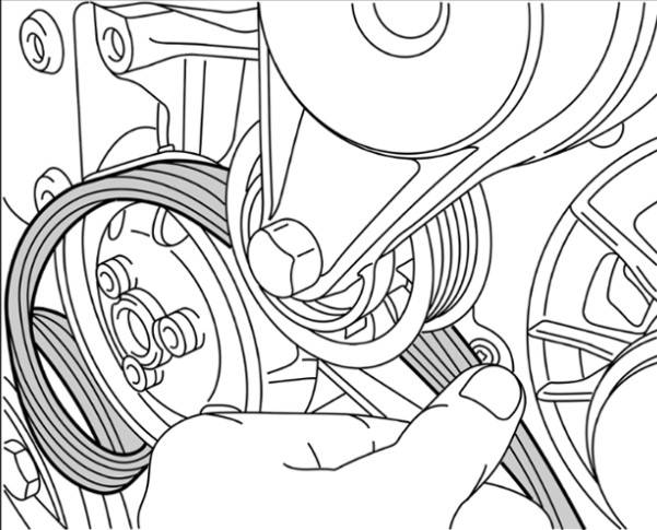 5 Провести верхний край ремня вокруг насоса системы охлаждения. Затем поставить ремень на ребро (повернуть на 90°) и провести за натяжителем ремня. Ход ремня - насос системы охлаждения