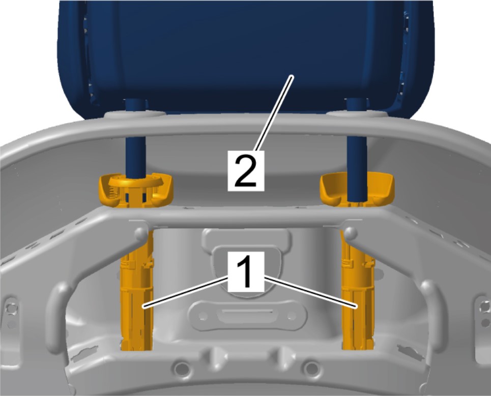 1 Нажать на разблокирующий элемент на левой направляющей подголовника -1- и с усилием потянуть подголовник переднего сиденья -2- вверх.