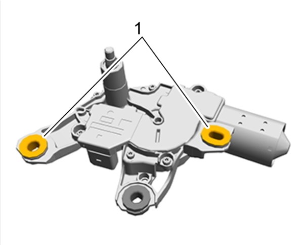 2 Установить двигатель заднего стеклоочистителя с подкладными шайбами -поз. 1-