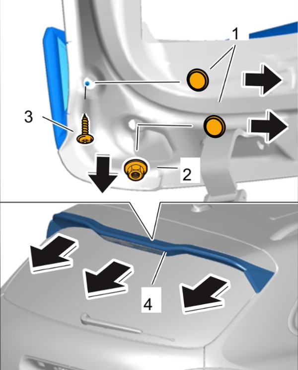 5 С помощью пластикового клина разблокировать задний спойлер в направлении стрелки -4-.