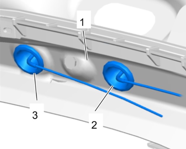 6 Удалить резиновые втулки -2, 3- антенны и дополнительного стоп-сигнала из задней крышки -1- и вынуть антенный кабель.