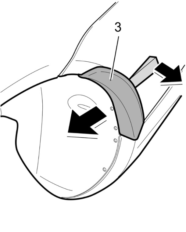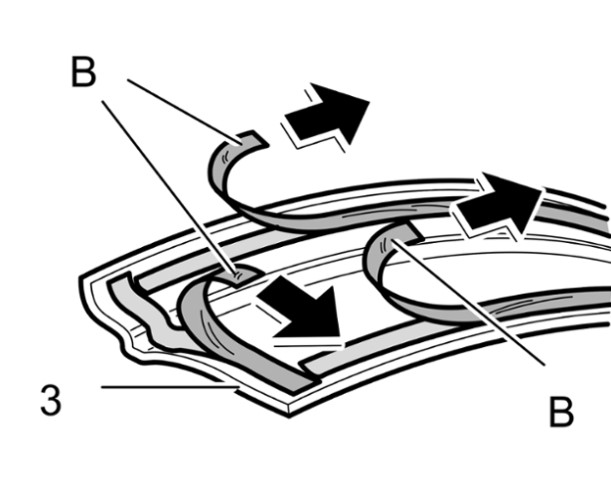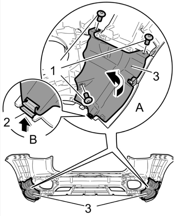 1.1 Расположить теплозащитный экран -3-на облицовочной рамке в -стрелкаrichtung A-и надвинуть крепежную скобу-2--стрелка B-.