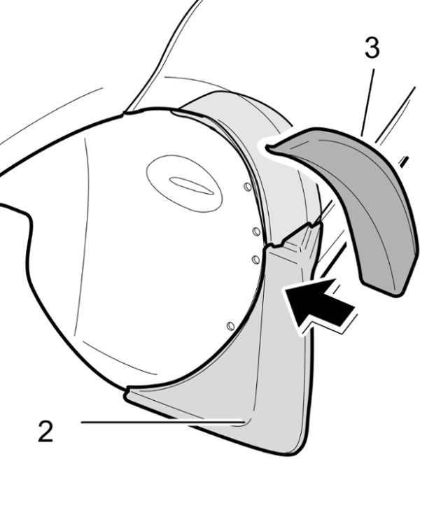 4.2 Выровнять облицовку колесной арки -3-на брызговике -2-и уложить на бампер.