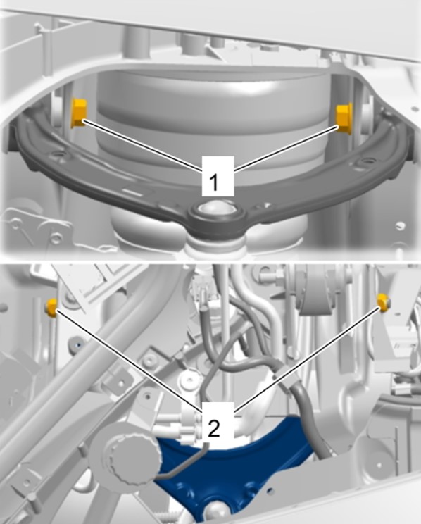1 Открутить крепежные винты -1- и вынуть поперечный рычаг подвески. Доступ к крепежным гайкам -2- возможен из водоотводящего короба.