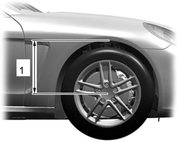 Все резьбовые соединения оси следует затягивать при нормальном положении подвески. Нормальное положение подвески означает: автомобиль стоит на колесах или подвеска колеса поднята универсальным подъемником. Размер -1- от нижней кромки крыла до центра оси соответствует нормальному положению подвески.