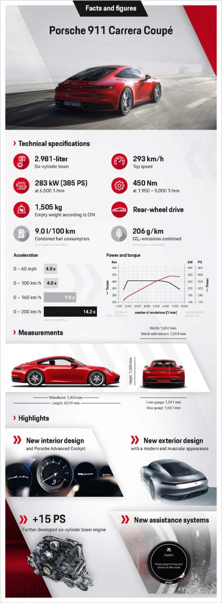 Двигатель, ходовая часть и тормоза, как и в модели Carrera S, рассчитаны на исключительную спортивность. Новые турбонагнетатели в трехлитровом шестицилиндровом оппозитном двигателе имеют турбинные и компрессорные колеса меньшего диаметра. Передачу крутящего момента обеспечивает новая восьмиступенчатая коробка передач с двумя сцеплениями (PDK). В результате разгон с места до 100 км/ч у 911 Carrera Coupé занимает 4,2 секунды, а максимальная скорость составляет 293 км/ч. В комплектации с опциональным пакетом Sport Chrono время разгона до «сотни» сокращается еще на 0,2 секунды. Расход топлива, пересчитанный по методу NEDC, для Coupé составляет 9,0 л/100 км, для Cabriolet 9,2 л/100 км (в смешанном цикле).