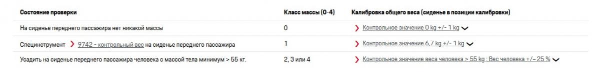18.1.2 Положить специнструмент 9742 - контрольный вес на сиденье переднего пассажира. Контрольная лампа отключения подушки безопасности пассажира в центральной консоли должна гореть. Сравнить данные (см. далее) таблицы с данными тестера PIWIS.