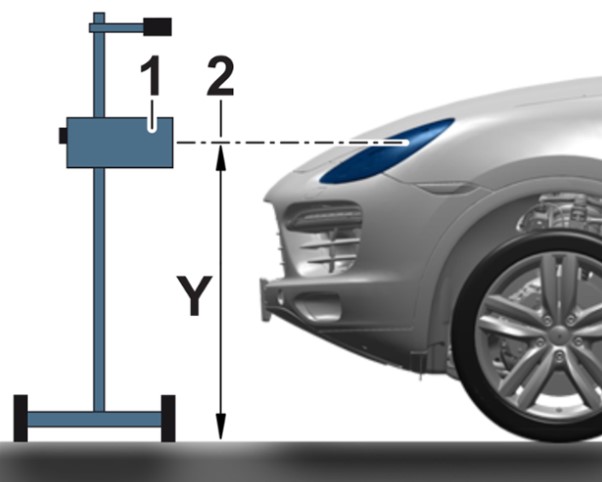 1 Расположить прибор для регулировки фар -1- и выровнять по средней оси -2- ближнего света.