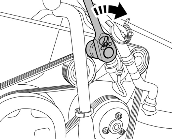 3 Ослабить натяжение и снять приводной ремень. Для этого натяжитель ремня за шестигранник Шестигранник натяжителя ремня накидным ключом (размер ключа 30 мм) или ключом-трещоткой со сменной торцовой головкой провернуть по часовой стрелке Ослабление ремня (ослабить натяжение) и снять приводной ремень с натяжного ролика. Затем плавно снять усилие с натяжителя ремня.