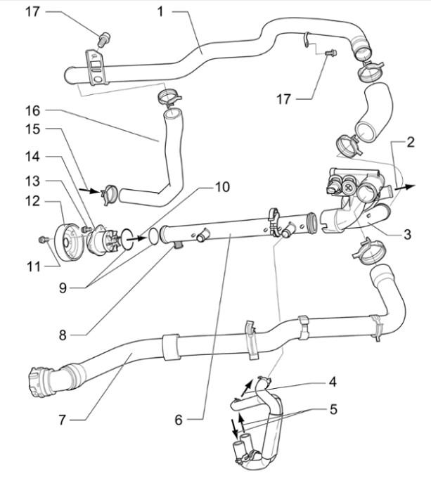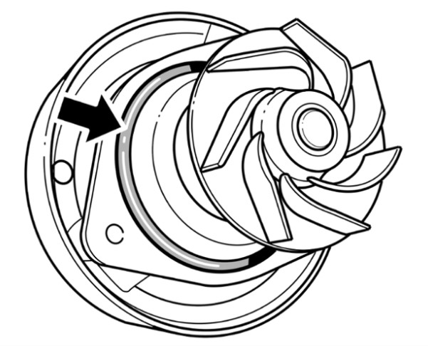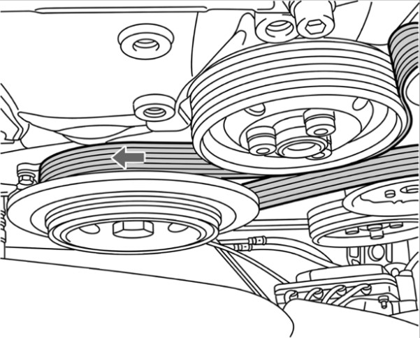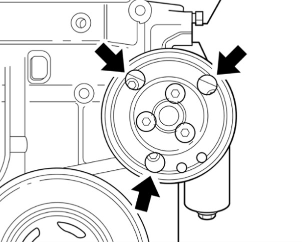 3 Приводное колесо водяного насоса повернуть так, чтобы можно было достать до крепежных болтов через отверстия в ременном шкиве -стрелки-.