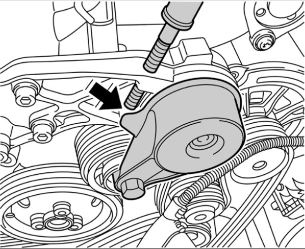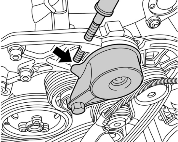 2 Ослабить и снять приводной ремень. Для этого в натяжитель ремня вкрутить болт М8.