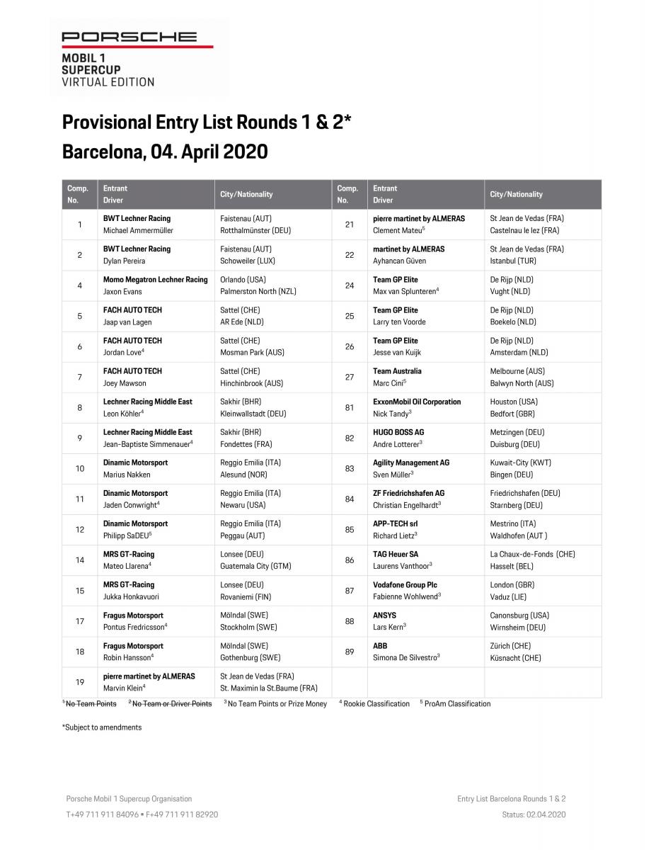 Виртуальный суперкубок Porsche Mobil 1 проводится на платформе iRacing. Календарь предусматривает четыре этапа – каждый состоит из двух гонок по 25 минут. После первого этапа на трассе Барселона-Каталунья гонки пройдут на трассах в Сильверстоуне (Великобритания/18 апреля), Спа-Франкоршаме (Бельгия/25 апреля) и Монце (Италия/16 мая).