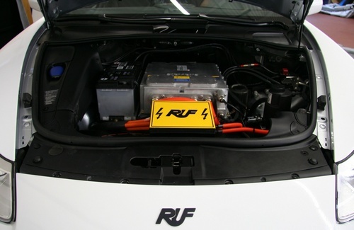 В движение «зеленый» автомобиль приводит 362-сильный электромотор Siemens, питающийся от комплекта литий-ионных батарей Li-Tec. Заряжать аккумуляторы можно от домашней сети или при помощи специальных дорожных электрозаправок. Лимит одной прогулки на eRUF Stormster составляет 200 км.