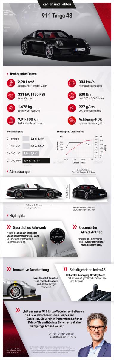 Как и модели 911 Carrera, оба варианта 911 Targa получили более мощные шестицилиндровые оппозитные двигатели с рабочим объемом три литра и двойным турбонаддувом. Прибавка в мощности положительно сказалась как на спортивной динамике, так и на пригодности к повседневной эксплуатации. Двигатель 911 Targa 4 развивает 283 кВт (385 л.с.) при 6500 об/мин. Это на 11 кВт (15 л.с.) больше, чем в предыдущей модели. Максимальный крутящий момент составляет 450 ньютон-метров и остается постоянным в широком диапазоне от 1950 до 5000 об/мин. 911 Targa 4S прибавил по сравнению со своим предшественником 22 кВт (30 л.с.) и теперь развивает 331 кВт (450 л.с.), максимальный крутящий момент 530 ньютон-метров (плюс 30 Нм) доступен в диапазоне от 2300 до 5000 об/мин.