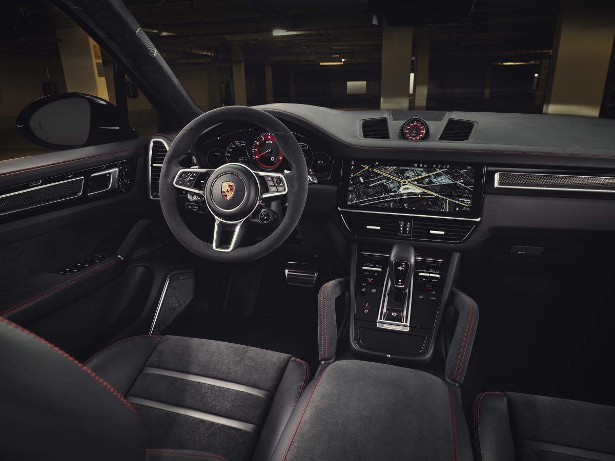 Высококачественные материалы, такие как алькантара, которой обтянуты потолок, центральные части сидений, подлокотники центральной консоли и дверные панели, а также темный сатинированный алюминий, придают салону Cayenne GTS спортивный и элегантный вид. Серийные спортивные сиденья с восьмипозиционной регулировкой и дополнительно завышенными боковыми валиками отлично фиксируют тело даже при динамичном прохождении поворотов. Эти сиденья предлагаются исключительно для новых моделей GTS. На передних дверях, накладках порогов, тахометре и подголовниках можно видеть надписи «GTS». Среди многочисленных возможностей индивидуализации предлагается в частности пакет отделки интерьера GTS с дополнительными контрастными акцентами цвета Carmine Red или Crayon, в которых выполняется, например, декоративная прострочка.