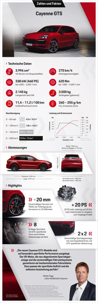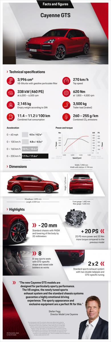 Четырехлитровый битурбированный двигатель V8, известный по топ-модели Cayenne и являющийся собственной разработкой Porsche, в новых моделях Cayenne GTS выдает на 14 кВт (20 л.с.) и на 20 Нм больше по сравнению с предыдущей моделью. Это ведет к значительному улучшению ходовых качеств: на стандартный разгон с места до 100 км/ч с пакетом Sport Chrono теперь уходит на 0,6 секунды меньше, чем раньше. Максимальная скорость автомобиля возросла на 8 км/ч. Одновременно с тем большое внимание уделено повышению топливной экономичности. Снижению расхода топлива в частности способствуют оптимальная настройка восьмиступенчатой автоматической коробки передач Tiptronic S, адаптивная система отключения цилиндров, система непосредственного впрыска топлива с центральным расположением форсунок и интеллектуальная система управления тепловым режимом охлаждающего контура. Расход топлива в смешанном цикле NEDC у самой спортивной модели Cayenne составляет 11,4 – 11,2 литра на 100 километров.