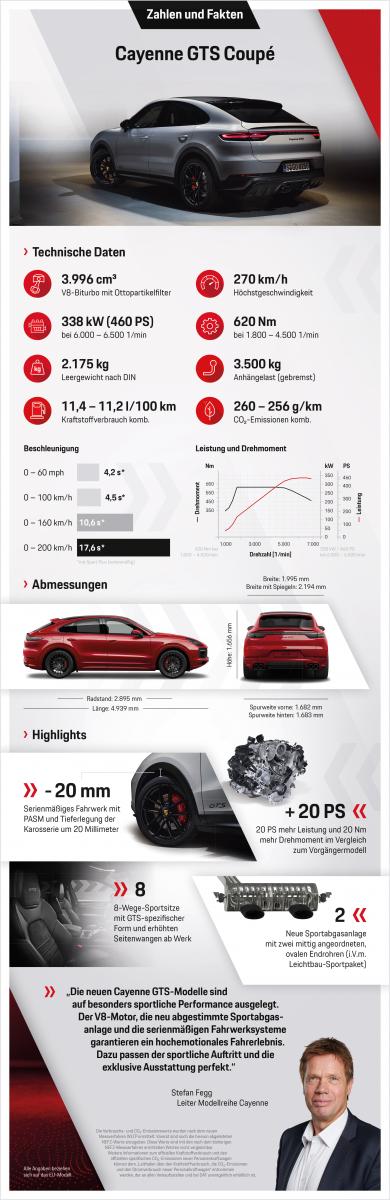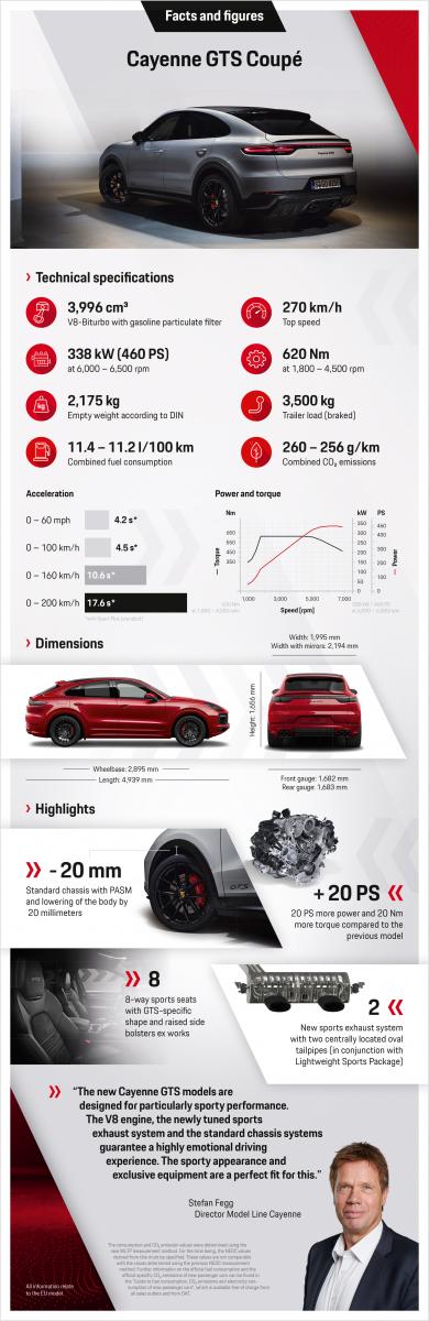 Штутгарт. Два эксклюзивных спортсмена: компания Porsche пополняет модельный ряд SUV двумя новыми моделями Cayenne GTS и Cayenne GTS Coupé, которые ориентированы на повышенную динамику. Как и у всех Porsche с аббревиатурой GTS, особо важное значение имеет привод: вместо 3,6-литрового двигателя V6 битурбо предыдущей модели под капотом нового Cayenne GTS теперь вновь «бьется» восьмицилиндровое «сердце». Четырехлитровый двигатель V8 с двойным турбонаддувом (битурбо) мощностью 338 кВт (460 л.с.) и крутящим моментом 620 Нм обеспечивает заметно более высокие динамико-скоростные характеристики. Разгон с места до 100 км/ч обе модели GTS, оснащенные пакетом Sport Chrono, выполняют всего за 4,5 секунды, максимальная скорость составляет 270 км/ч. Новые модели получили заниженную подвеску, рассчитанную на повышенную динамику, уникальный дизайн в стиле GTS и богатую комплектацию.
