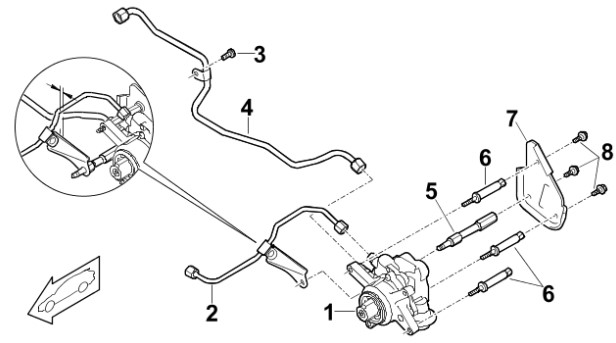 4 Трубопровод низкого давления; удерживать от проворота за шестигранник насоса высокого давления
