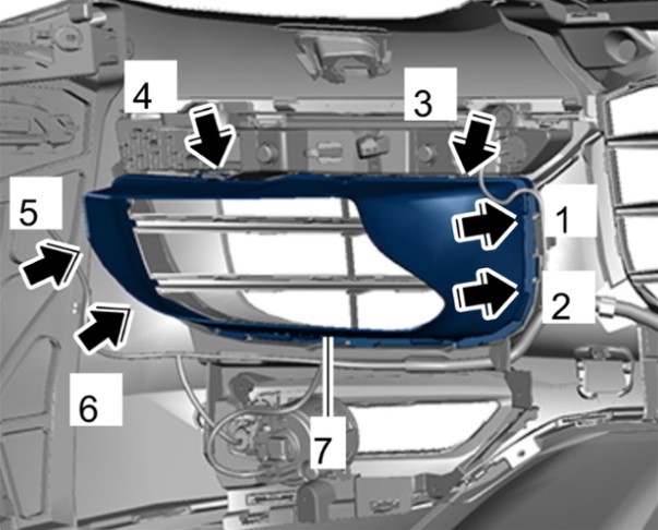 1 Оттянув вентиляционный канал -7- назад, удерживать его в этом положении и разблокировать фиксаторы в указанной последовательности -1 по 6-.