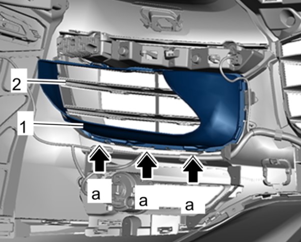 2 С помощью пластикового клина отжать фиксаторы наверх -a- и извлечь вентиляционный канал -1- из передней вентиляционной решетки -2- движением назад.