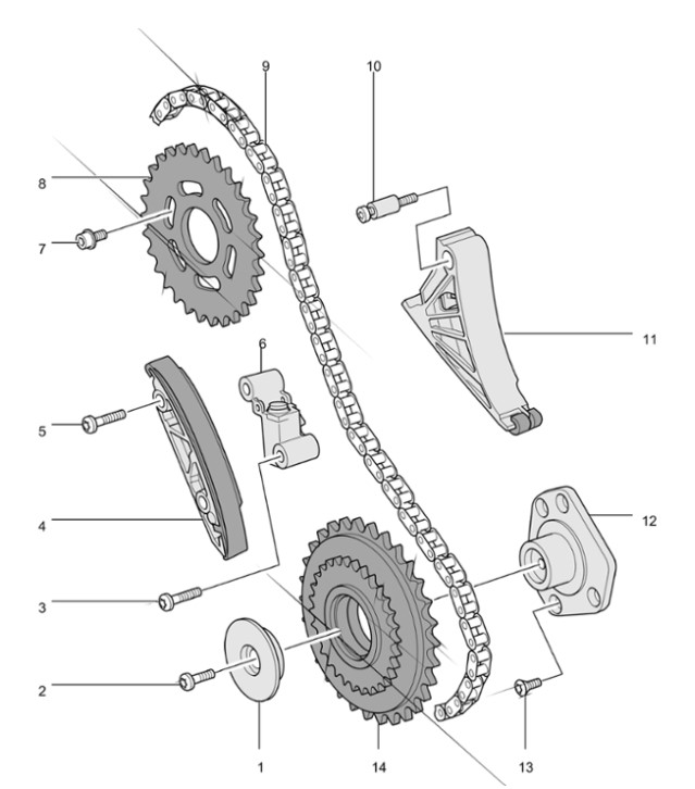 14 Снять звездочку распределительного вала, натяжитель цепи и цепь ГРМ (цилиндры 1-3).