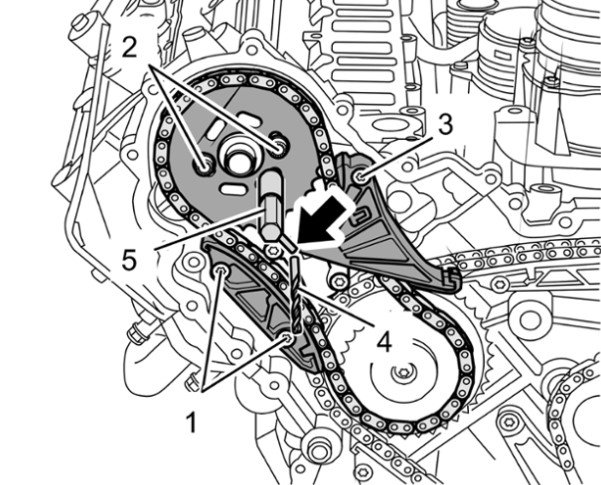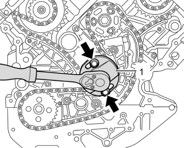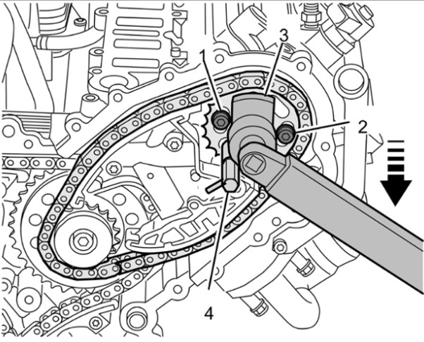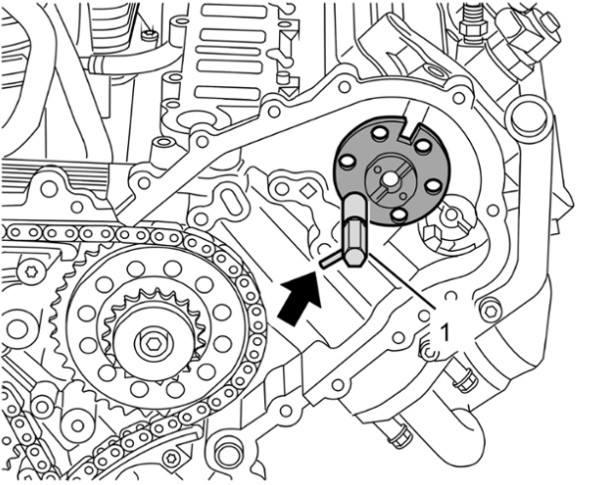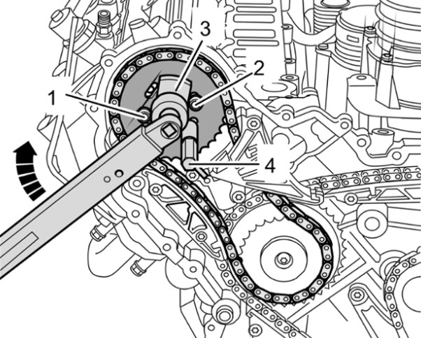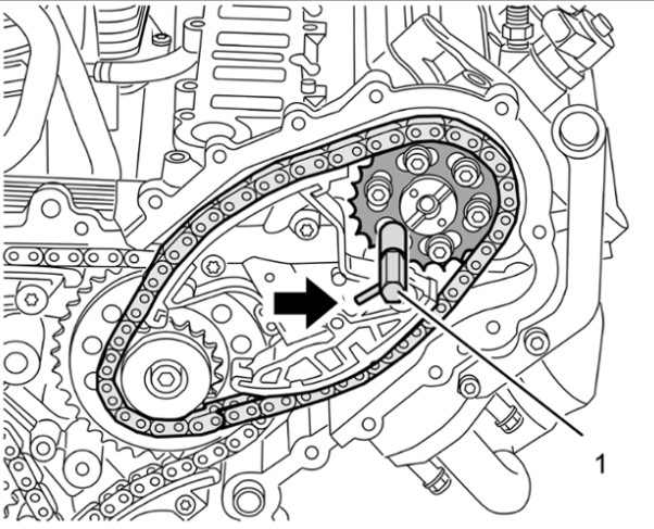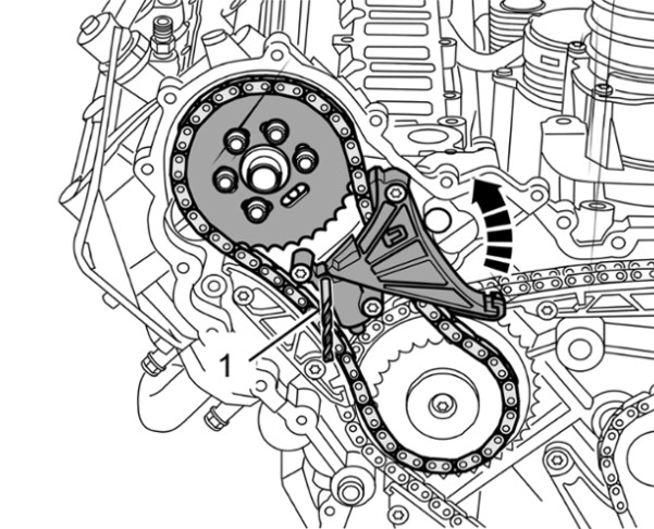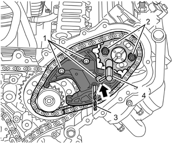 12 Прижать планку натяжителя цепи ГРМ (цилиндров 1-3) в -направлении стрелки- и зафиксировать натяжитель цепи с помощью сверла Ø 3,3 мм -1-.