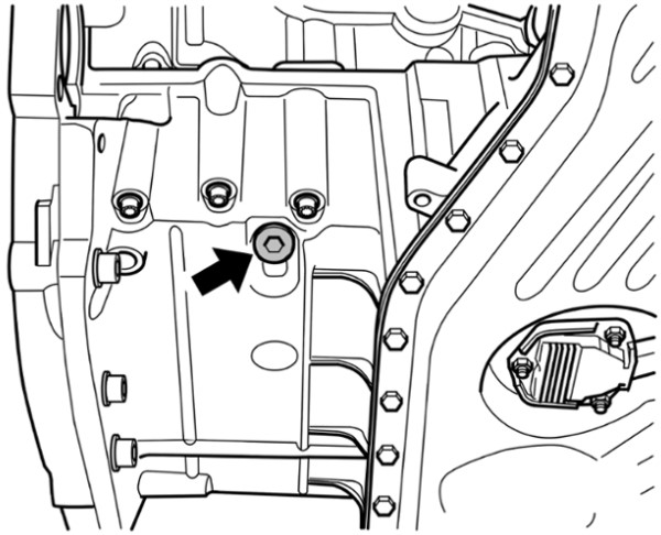 5 Вывернуть из верхней части масляного поддона запорный винт метки “ВМТ” -стрелка-. Собрать вытекающее моторное масло.