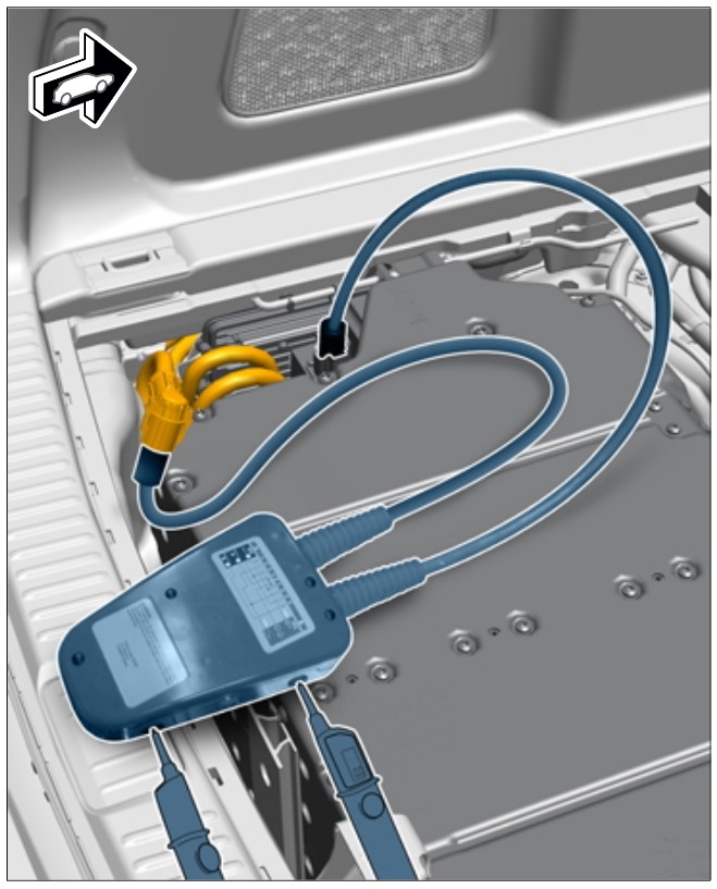 8 Измерьте напряжение на обоих высоковольтных контактах высоковольтной АКБ с помощью VAS 6558/9-7 - высоковольтных проверочных адаптеров HVR 40, актуального тестера и VAS 6558A - высоковольтного проверочного адаптера.