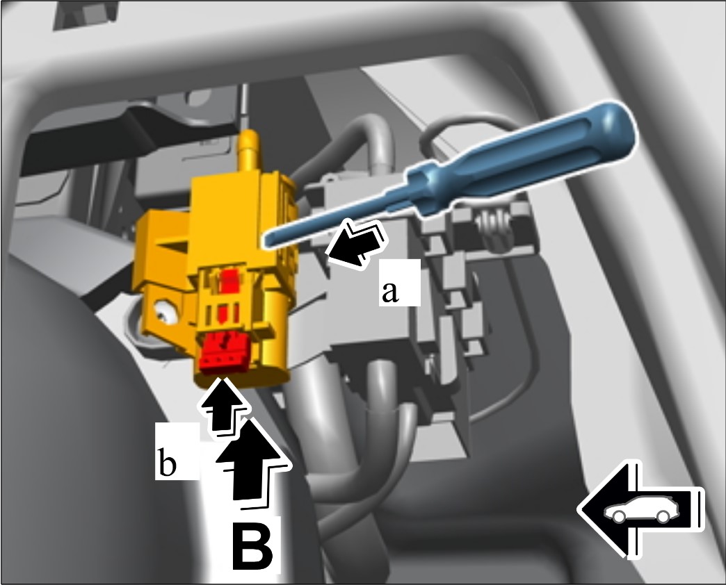 5 Разблокировать сервисный разъем с помощью небольшой отвертки -а-, слегка прижать крючок вниз и вставить его -b-. Соединить сервисный разъем -B-.