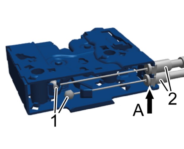 2 Проверить, правильно ли закреплена тяга замка передней крышки -2- в замке передней крышки слева и справа -стрелка A-: