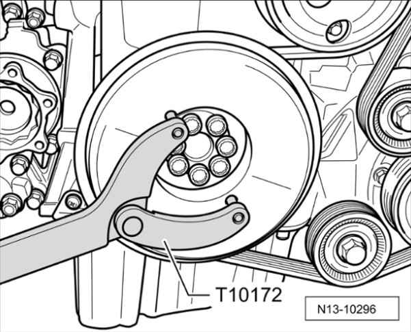 1 Зафиксировать демпфер крутильных колебаний с помощью T10172 - контропоры.