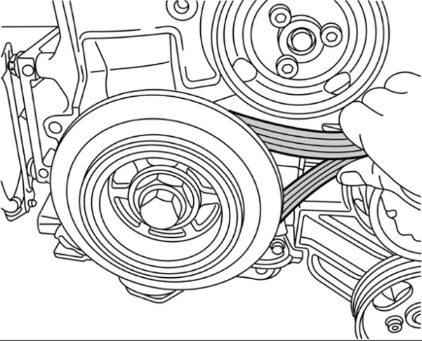 4 Пометить мелом направление вращения приводного ремня и снять приводной ремень с демпфера крутильных колебаний.