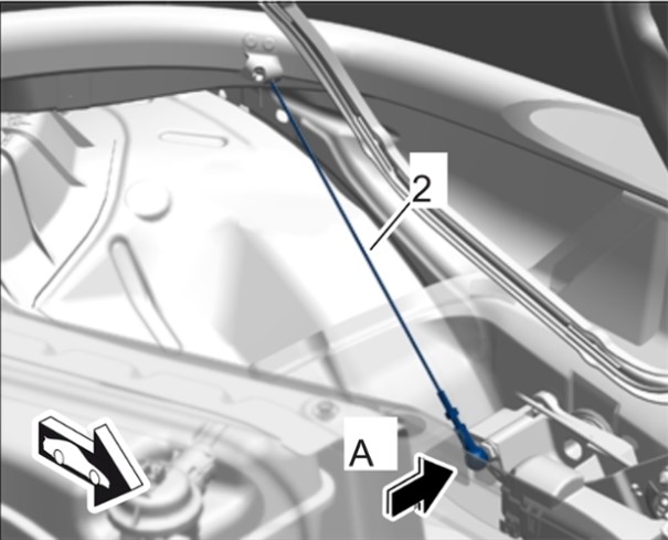 4 Зафиксировать натяжные тросы -2- слева и справа через отверстие дуги безопасности в направляющих -стрелка A-.