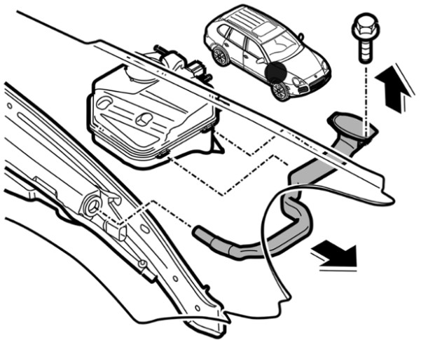 2 Открыть крышку заливной горловины расширительного бачка ОЖ и выкрутить находящийся под ней винт. Снять заливную горловину с расширительного бачка ОЖ и извлечь из бачка стеклоомывателя.