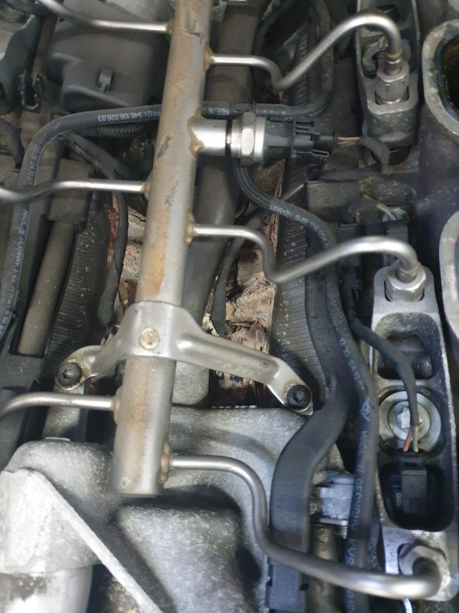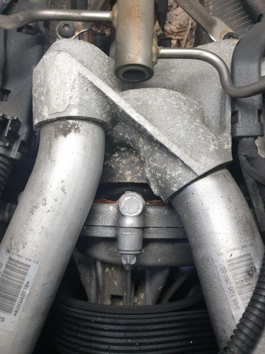 Сняли впускной коллектор и увидели засохший антифриз в развале блока цилиндров (фото прилагаю). Не смогли увидеть очевидного места течи и сказали, что похоже что антифриз течет только на горячем двигателе. Подскажите пожалуйста куда смотреть?