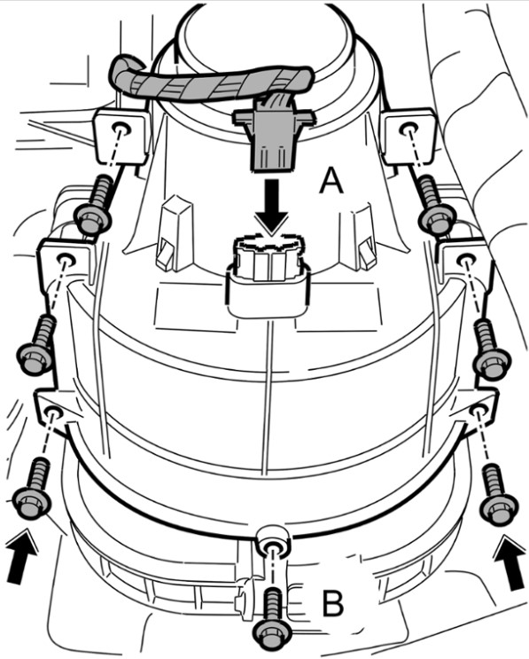 2 Удерживая вентилятор, вкрутить и затянуть семь винтов крепления -B-.