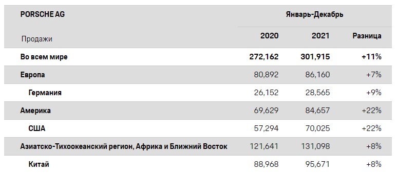 Штутгарт. Самый высокий объем продаж в истории компании: в 2021 финансовом году клиентам по всему миру было передано 301 915 автомобилей Porsche. Таким образом, по сравнению с 2020 годом компания Porsche добилась увеличения объема продаж на одиннадцать процентов. Свой вклад в рост продаж внесли все регионы сбыта Porsche. Наиболее высокого роста компания Porsche достигла на американском континенте. Самым крупным рынком сбыта для Porsche по-прежнему остается Китай.