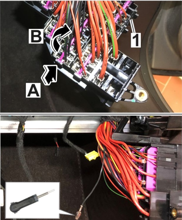 Необходимо учитывать и соблюдать указания по зачистке, обжатию, усадке/изолированию электрических проводов. Порядок действий подробно описан в разделе VAS 1978/35-33 - Комплект разблокирующих инструментов.