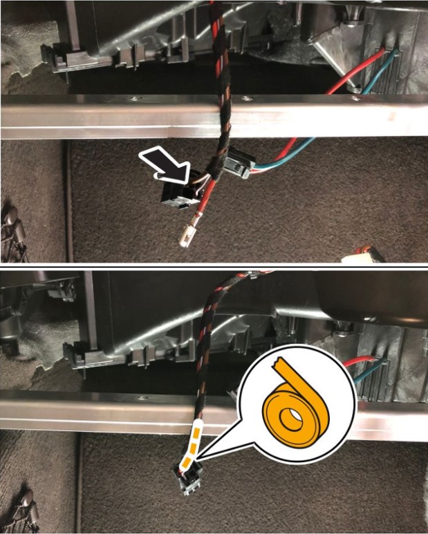 2.8.4 Обмотать красный провод на жгуте проводов тканевой клейкой лентой, полностью восстановив защитную оболочку.