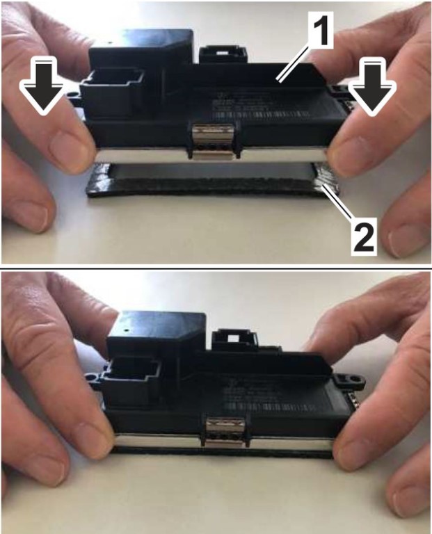 2.9.2 Держать регулятор вентилятора -1- в перевернутом положении над уплотнением и выровнять его без контакта с клеевой поверхностью.