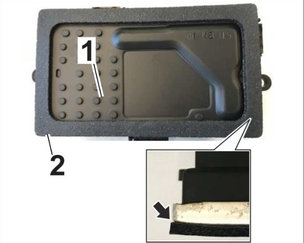2.1 Отсоединить уплотнительную полоску (шнур из синтетического каучука) -1- от устройства обогрева и подачи приточного воздуха -2-.