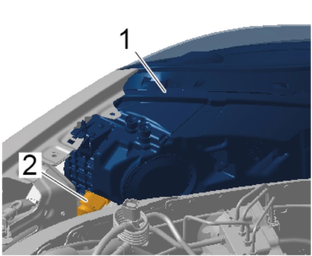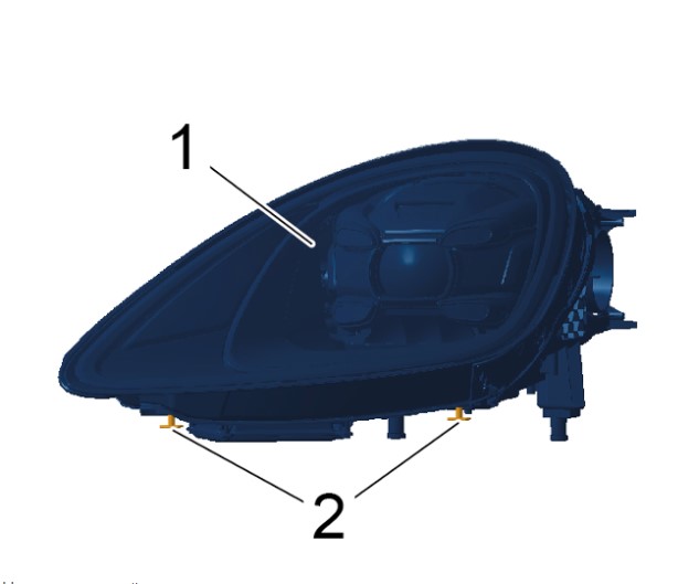 Вставить новую фару -1- в держатель до тех пор, пока скоба -2- не зафиксируется.