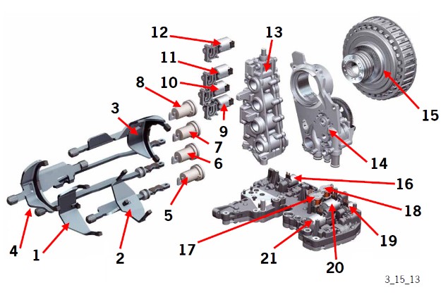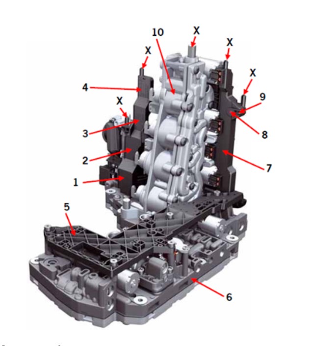 Блок управления коробки передач (также — «гидравлическое устройство переключения (HSG)», «мехатроник» или «золотниковый блок») состоит из устройства управления электроники коробки передач (PDK), золотникового блока (исполнительных элементов) и части датчиков:
